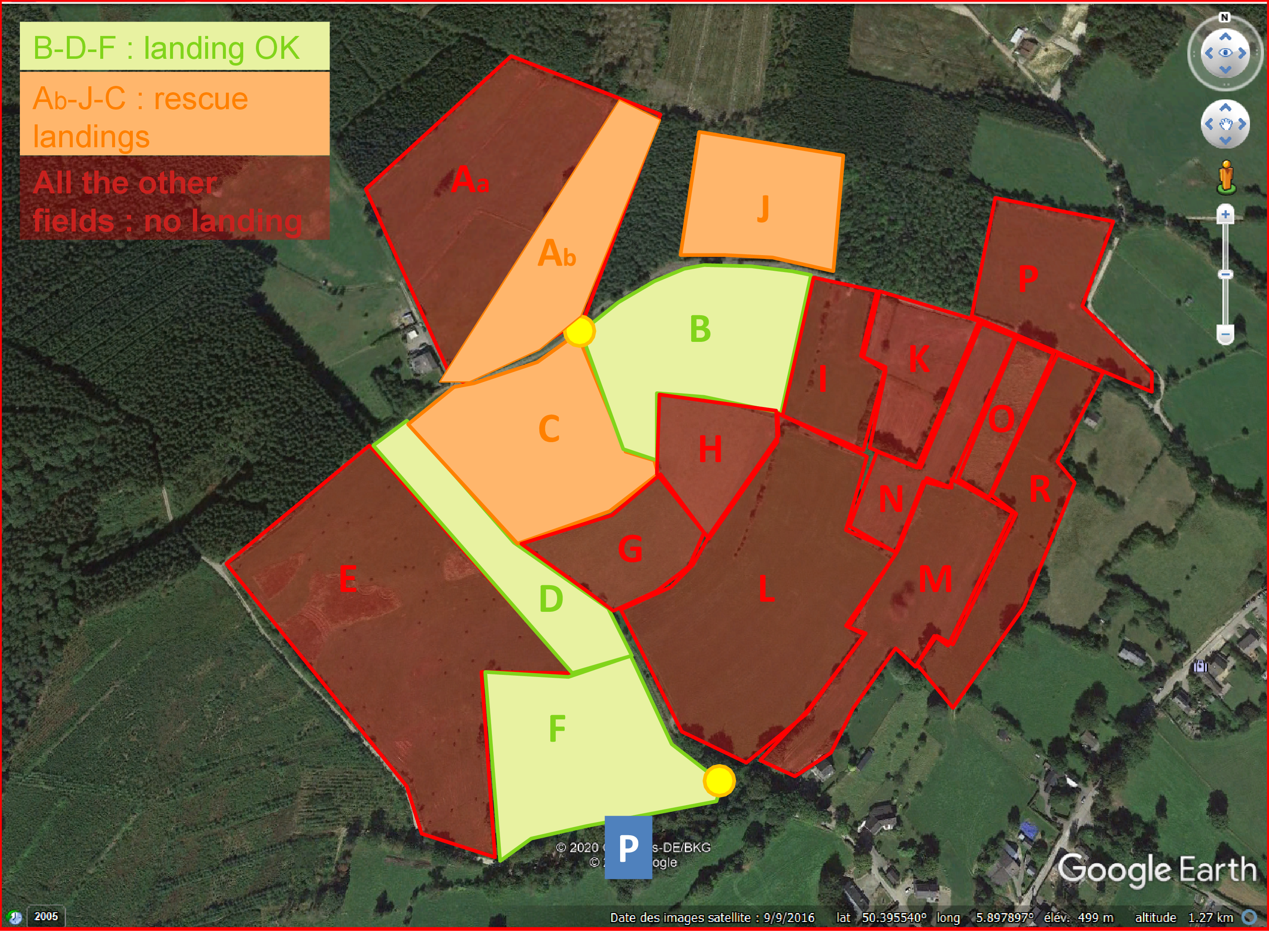 Dans l'intérêt des nouvelles négociations pour revalider l'utilisation possible des atterrissages derrière les sites de Coo, sur le plateau de Ster, nous vous demandons de scrupuleusement respecter la carte ci-jointe pour les atterrissages "au sommet". On doit poser dans les zones en vert. Pour raison de sécurité, on peut utiliser les attérros de secours en orange, mais il est interdit (pour le moment) de poser partout ailleurs.