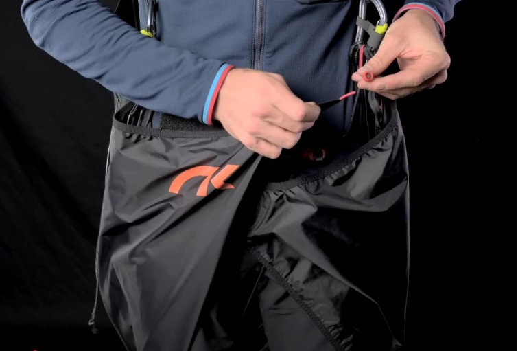 Le harnais Niviuk Arrow P a été retrouvé avec un système de sangles non fermé (sangle de jambe et sangle frontale). Cependant, le sac de jambe était fermé. Avec ce type de harnais, il est nécessaire d'enfiler la sangle de jambe (fermée) du système de sangles Getup avec la jambe droite (Figure 1).