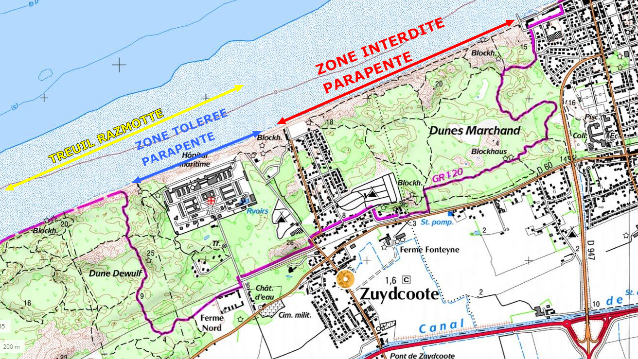 Certains ont cru pouvoir contester auprès de la mairie en s’appuyant sur l’existence d’un site officiel FFVL à Zuydcoote. Ce site existe bel et bien MAIS il s’agit d’un site de treuil et uniquement de treuil situé sur l’estran côté hôpital maritime, ce site est strictement réservé au treuil et véhicule du club RAZMOTTE et les vols s’effectuent au-dessus de l’estran (au moins à basse altitude).