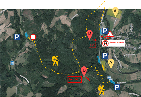 | Route : | En sortant de l’atterrissage Sud côté La Roche en Ardenne, prendre le sentier qui monte à droite qui mène à la chapelle de Saint-Thibault. (chemin de descente des VTT qui sinue). L’accès en voiture via « Warizy-Hodister » est à éviter. L’accès à pied est aussi rapide que l’accès en voiture. Il y a des zones de parking au pied du site. Parking à éviter devant la pizzéria. |