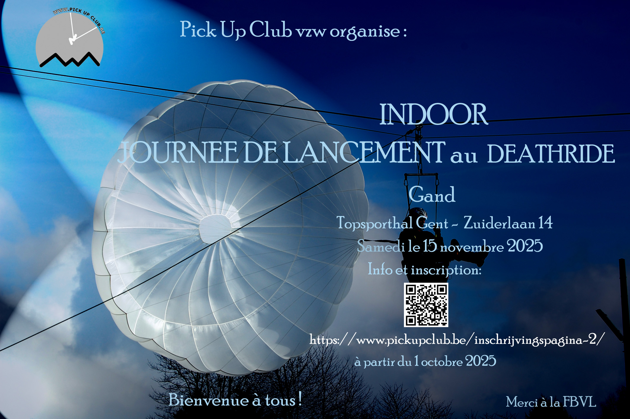 Publié le Tuesday 30 September 2025 par jeanJournée de lancement de parachute à la tyrolienne le 15 novembre à Gand Inscriptions à partir du premier octobre sur: https://www.pickupclub.be/inschrijvingspagina-2/